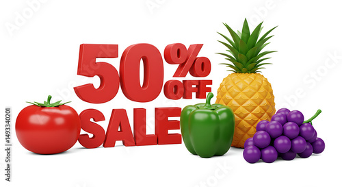 50% off 3D with some market object isolated on white background