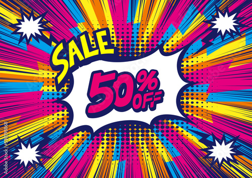 50 Percent OFF Discount on a Comics style bang shape background. Pop art comic discount promotion banners.