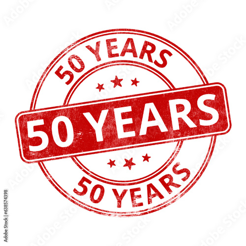 ‘50 Years’ circular red rubber stamp seal with distressed texture isolated on transparent background