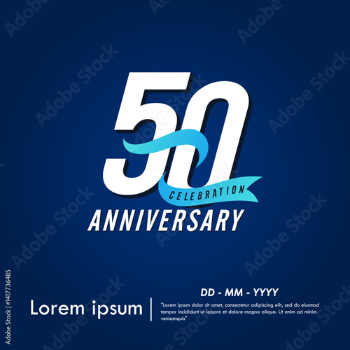 50th years anniversary celebration emblem. elegant anniversary logo isolated with blue ribbon on dark blue background. vector illustration template design for web, flyers, poster, greeting card