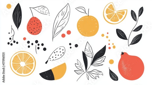 57.A collection of trendy abstract nature-themed doodle icons in freehand style, featuring minimalist fruit shapes like oranges, berries, and leaves. The icons are drawn with clean, fluid lines,