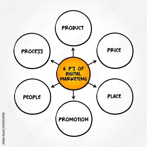 6 Ps of Digital Marketing expand on traditional marketing principles to create a successful online strategy, mind map concept background