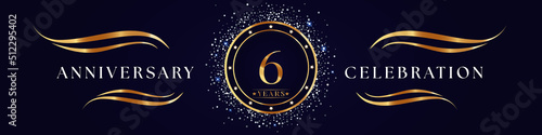 6 Years Anniversary Logo Golden Colored isolated on purple blue background. Poster Design for anniversary event party, wedding, birthday party, ceremony, greetings and invitation card.
