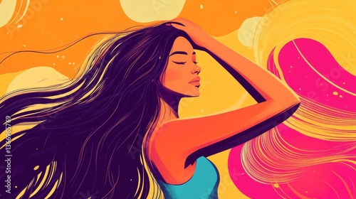 60.A vibrant, high-contrast image of a young woman combing her long hair, the gentle flow of her hair accentuated against a bold, colored background, creating an energetic and fresh vibe perfect for