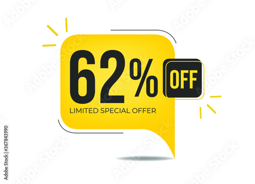 62% off limited special offer. Banner with sixty-two percent discount on a yellow balloon.