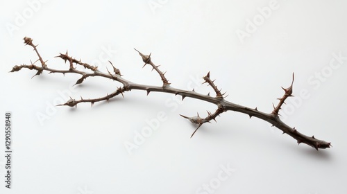 62.A single dry rose branch with sharp thorns, intricately detailed and set against a pure white background, highlighting its rugged texture and organic structure.