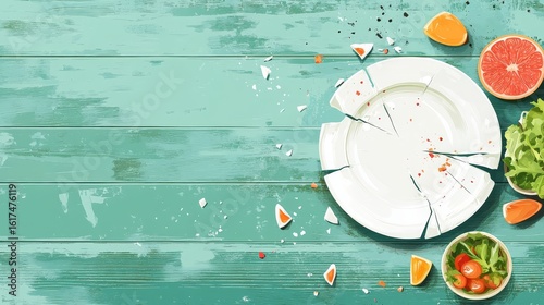 65.A minimalist vector illustration of a broken white plate on a wooden table painted in shades of green. The plate's broken pieces lay next to a small salad bowl and some fresh fruits, representing