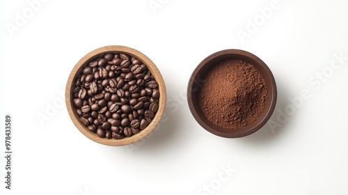 7. Flat lay of a wooden bowl filled with roasted coffee beans next to a bowl of rich coffee powder, isolated on a clean white background