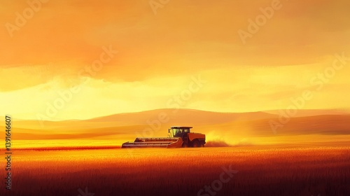 71.A serene rural scene with a lone combine harvester in the middle of a vast golden field, surrounded by gentle rolling hills and a vivid sunset sky.