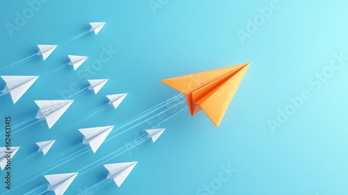 74.A striking 3D rendering of a bright orange paper plane flying ahead of a neatly arranged fleet of white planes, leaving a bold trail against a gradient blue sky.