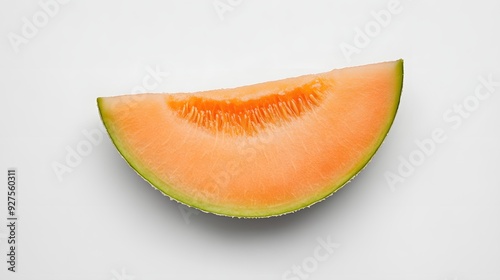 75. "A detailed image of a fresh slice of cantaloupe melon isolated against a pristine white backdrop, highlighting its vitamins and nutrients