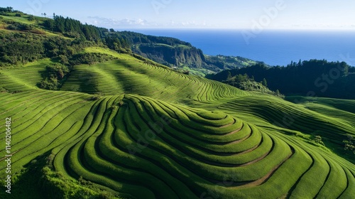 76.Aerial drone view capturing the unique, flowing lines of tea terraces at the Cha Gorreana plantation in Sao Miguel, Azores; vibrant green rows following the natural contours of the hillside,