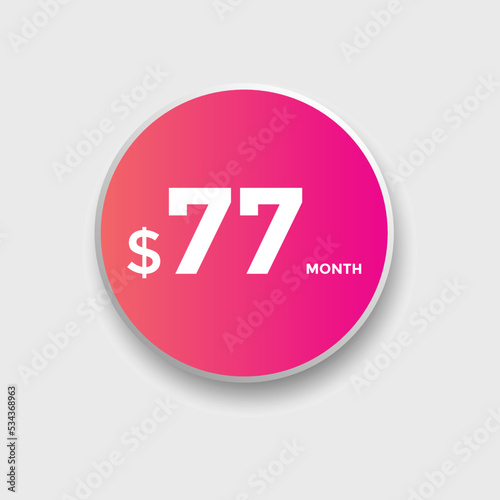 77 dollar price tag. Price $77 USD dollar only Sticker sale promotion Design. shop now button for Business or shopping promotion