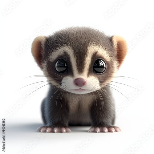 85. "Create a 3D image of a small baby ferret with big, soulful eyes, isolated on a pristine white background.