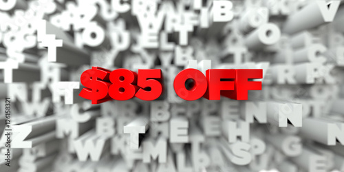 $85 OFF - Red text on typography background - 3D rendered royalty free stock image. This image can be used for an online website banner ad or a print postcard.