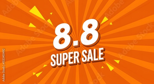 8.8 Super Sale Banner for 8th August Shopping Day with Bold 3D Text, Lightning and Bright Decorations on Orange Background