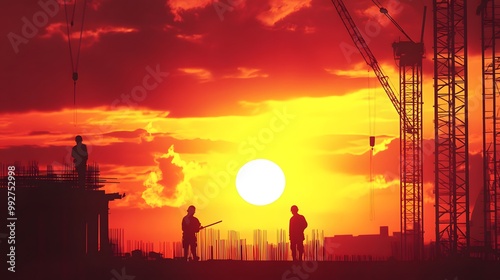 9. A dramatic sunset casting shadows on a construction site, with silhouettes of workers and machinery against a vibrant sky