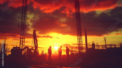 9. A dramatic sunset casting shadows on a construction site, with silhouettes of workers and machinery against a vibrant sky