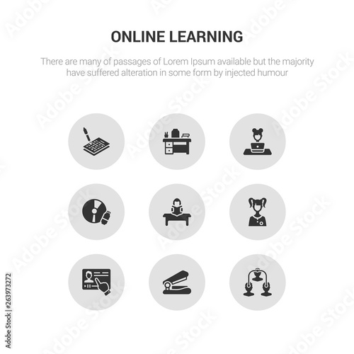9 round vector icons such as sociology, stapler, streaming, student, study contains study tools, studying, teacher desk, test. sociology, stapler, icon3_, gray online learning icons