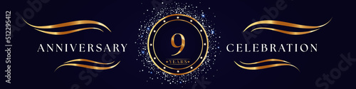 9 Years Anniversary Logo Golden Colored isolated on purple blue background. Poster Design for anniversary event party, wedding, birthday party, ceremony, greetings and invitation card.