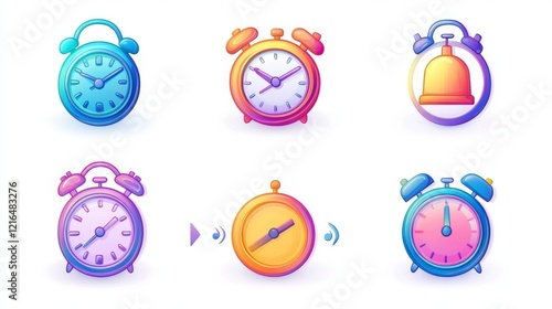 90.A stylized icon pack displaying a classic alarm clock with dynamic ringing effects, a bell icon muted by a slash line, and sound level symbols in a clean gradient design.