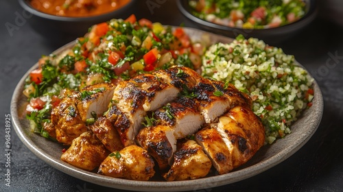 99. A plate of flavorful and spicy chicken shawarma with a side of tabbouleh
