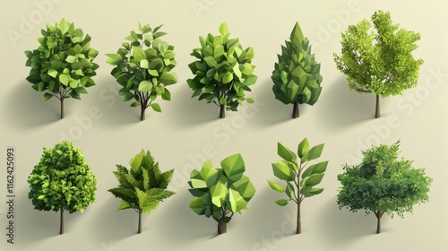9.Collection of low-poly shrub illustrations in a 3D vector style, each shrub designed with simplified, angular shapes and muted green hues, creating a modern, stylized appearance.