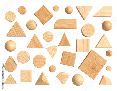 A - Scattered Wooden Geometric Pieces in Artistic Flat Lay Composition, Isolated on Transparent Background.