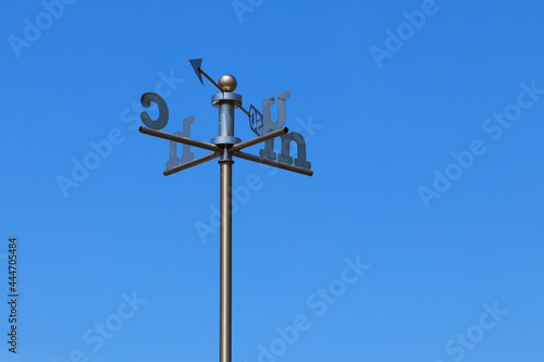A weather vane with Welsh letters for the direction against a clear blue sky