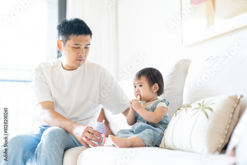 A 1 year old Taiwanese girl spending time playing happily with her parents, a man and woman in their 20s, in a room of a high rise apartment in Taichung City, Taiwan.