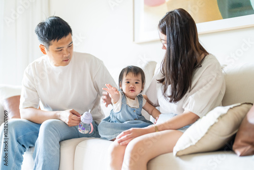 A 1 year old Taiwanese girl spending time playing happily with her parents, a man and woman in their 20s, in a room of a high rise apartment in Taichung City, Taiwan.