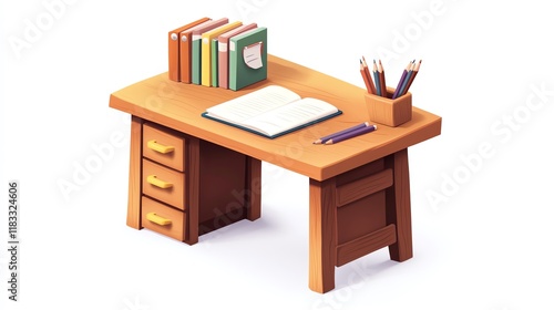 a 2D cartoon illustration of a school desk with books, pencils, and a notebook, organized and ready, white background--ar 16:9