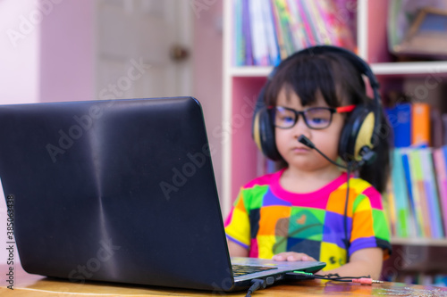 A 3 year old girl from ASEAN is studying online and chatting online.