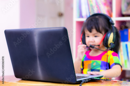 A 3 year old girl from ASEAN is studying online and chatting online.