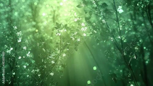 A 3D abstract representation of a forest with glowing trees and leaves made of translucent glass. Soft green light filters through the branches.