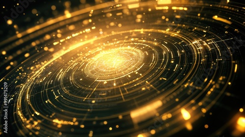 A 3D circular gold graph rotating in space, with highlighted segments and floating data points, representing the gold market performance in a high-tech interface.