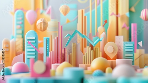A 3D depiction of economic growth, showcasing a wealth-building strategy with graphs, stock market symbols, and arrows pointing upward.