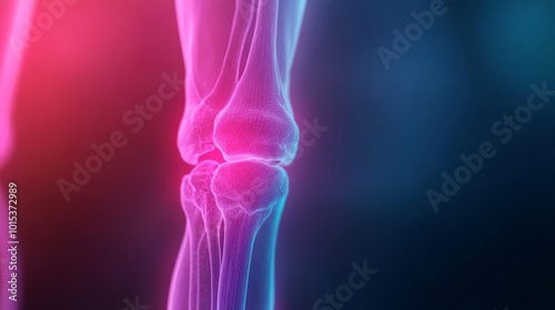 A 3D digital rendering displays a human knee joint showcasing detailed bone and cartilage structures. Bright red inflammation markers emphasize the severity of injury against a dark backdrop