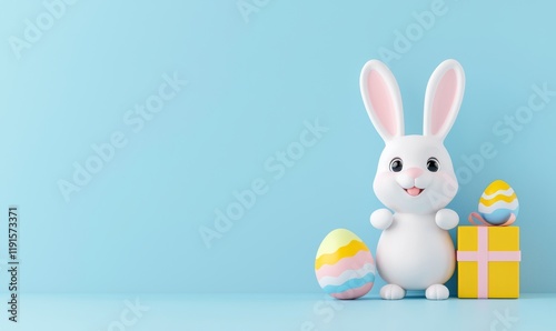 A 3D illustration featuring the Easter bunny inside an Easter egg, with a vibrant springtime Easter theme