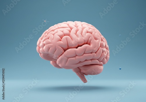 A 3D illustration of a realistic pink human brain floating against a soft blue background
