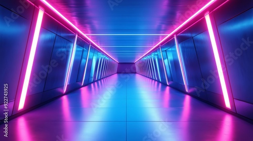 A 3D illustration of flying through an abstract, blue and purple futuristic interior. The corridor is illuminated by neon fluorescent lamps