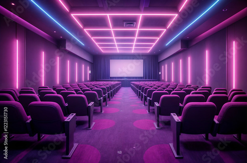 A 3D neon cyber digital arena with a purple glow, rows of techno seats and screens, providing an empty room for matches.