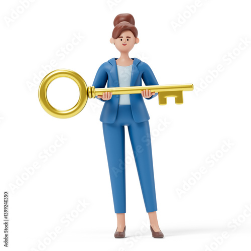 A 3D people holds a golden key, symbolizing success and achievement. 3D rendering, conceptual image. Isolated on white background.