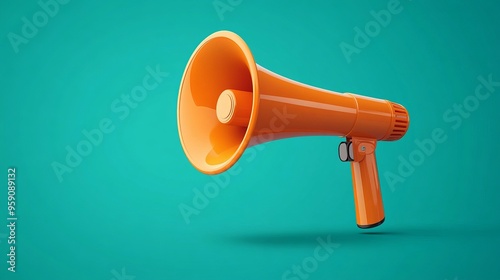 A 3D realistic orange megaphone shouting, depicted in a vector illustration on a green background. The modern cartoon-style design is ideal for concepts like "Join Us," job vacancies announcements