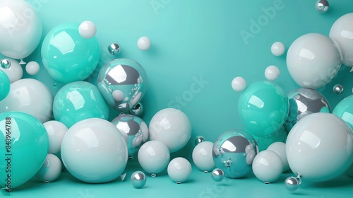 A 3D render illustration of realistic glossy turquoise, white, and silver balloons on a turquoise background, perfect for a tranquil, beach-themed event.