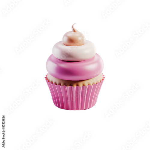 A 3D render of a cartoon-style pink cupcake with a white swirl on top. The cupcake is placed on a transparent background