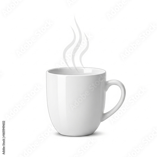 A 3D render of a white ceramic cup with hot steam rising, isolated on white background
