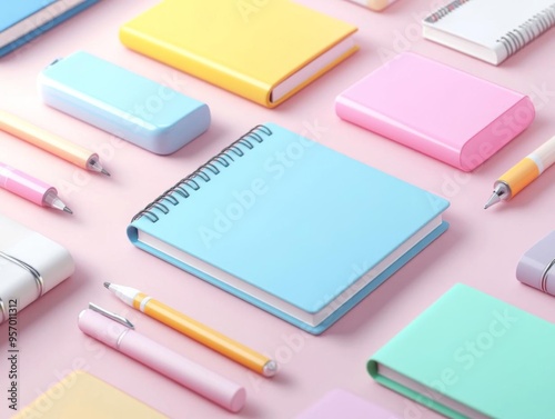 A 3D render of pastel notebooks and highlighters arranged in a grid on a pale pink background