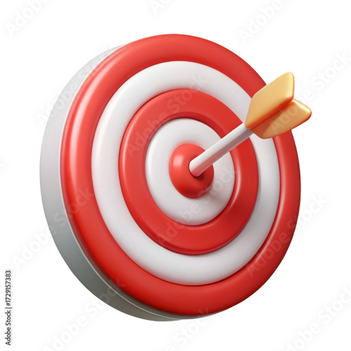 A 3d rendered dartboard with an arrow hitting the bullseye isolated on transparent background