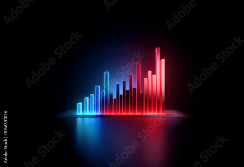 A 3D rendered glowing neon blue and red bar graph rises against a dark background. The graph is reflected on a shiny surface.